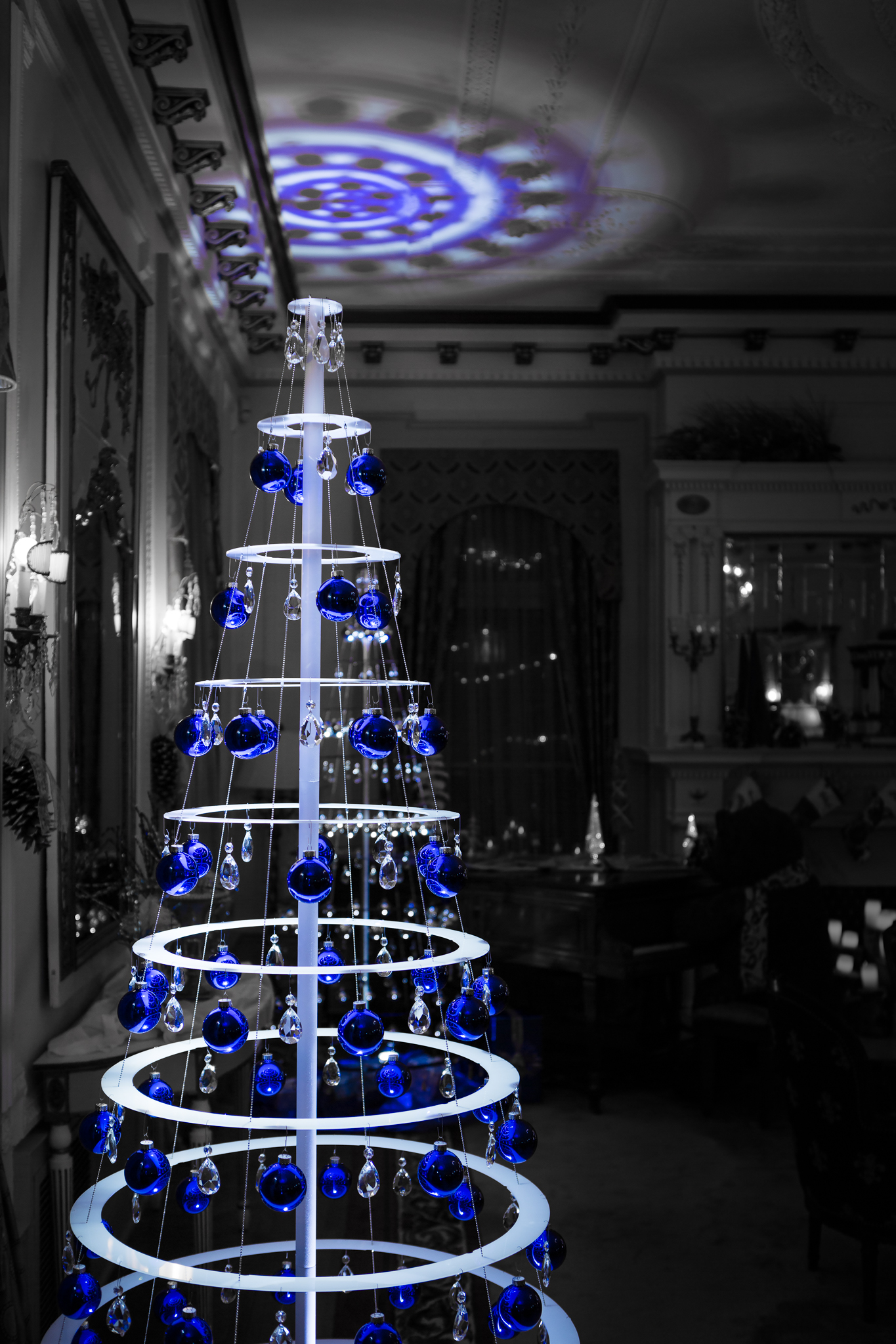 “I was recently granted the opportunity to display three of my Grandpa’s trees at the Governor’s Mansion. The tree is next to a chandelier from the White House, gifted to the Governor’s Mansion by the White House where the chandelier resided under many presidents. Because of the architectural integrity we were unable to hang the tree from the ceiling. We developed a stand for the tree for this reason, which will be available next year to the public.”