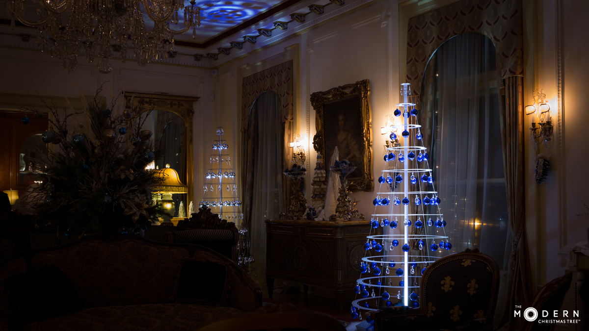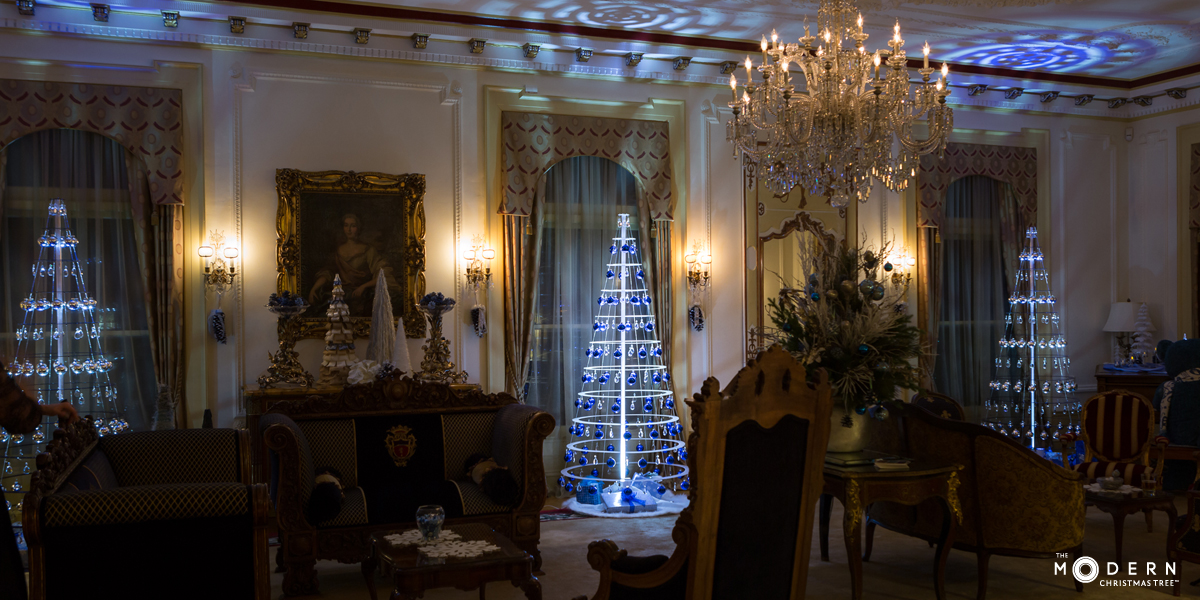 The Modern Christmas Tree is featured in the Governor’s Mansion this holiday season. Three of the mid-century modern trees are in the window under a famous chandelier from the White House.